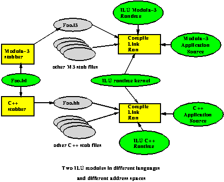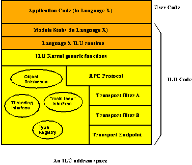 The approach used by ILU is one common to standard RPC systems such as Sun's ONC RPC, Xerox's Courier, and most implementations of OMG's CORBA. An interface is described once in some `language-neutral' interface specification language. Types and exceptions are described; exported functionality is specified by defining methods on object types. Tools are then run against the interface description to produce stubs for particular programming languages; these stubs can bind to, call, and be called from stubs generated from the same interface description for a different programming language. The stub code is then linked with the application code, some language-specific code containing any necessary ILU support for that programming language, and the ILU kernel library, which is code written in ANSI C. The following diagram illustrates the process: